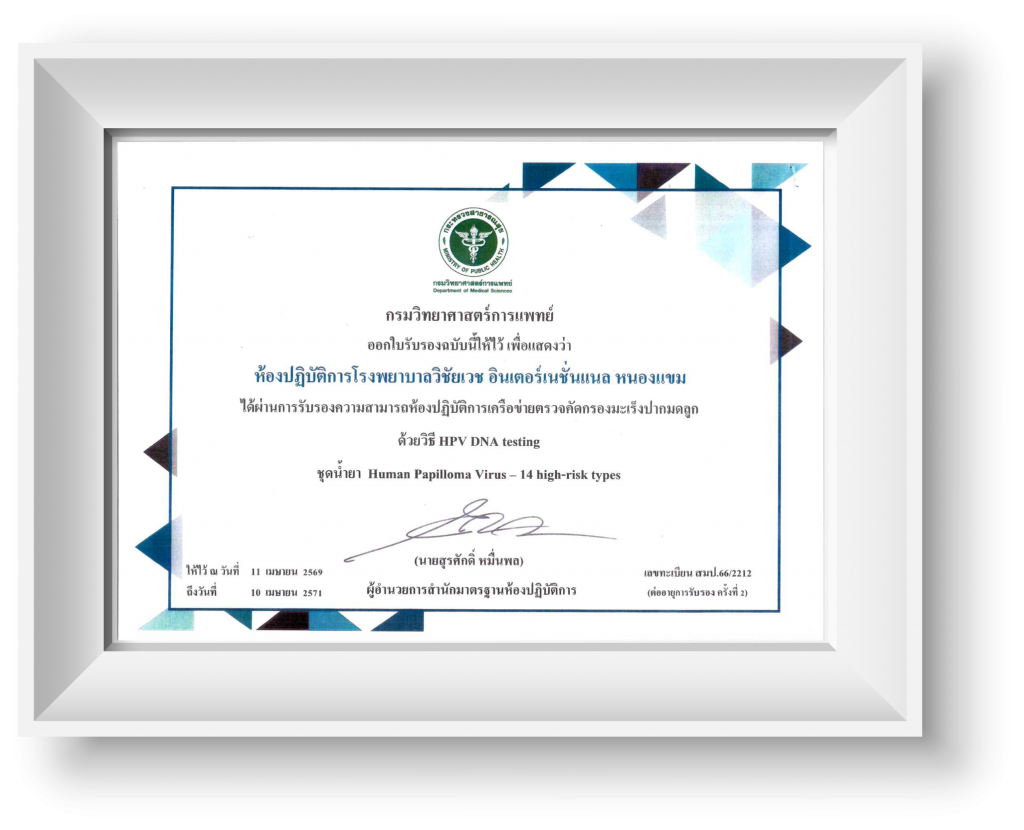 ผ่านการรับรองความสามารถห้องปฏิบัติการเครือข่ายตรวจคัดกรองมะเร็งปากมดลูก ด้วยวิธี HPV DNA testing ชุดน้ำยา Human Papilloma Virus - 15 high-risk typesห้องปฏิบัติการโรงพยาบาลวิชัยเวช อินเตอร์เนชั่นแนล หนองแขม ได้ผ่านการรับรองความสามารถห้องปฏิบัติการเครือข่ายตรวจคัดกรองมะเร็งปากมดลูก ด้วยวิธี HPV DNA testing ชุดน้ำยา Human Papilloma Virus – 15 high-risk types ตั้งแต่วันที่ 11 เมษายน 2569 – 10 เมษายน 2571 โดยกรมวิทยาศาสตร์การแพทย์