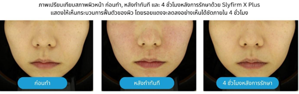 | Sylfirm X Plus | เจ็บน้อยมาก (แปะยาชา จี๊ดเบา ๆ) | 1–3 ชม. กลับบ้านได้ทันที | ผิวแน่น กระชับ ฝ้าลดลง |