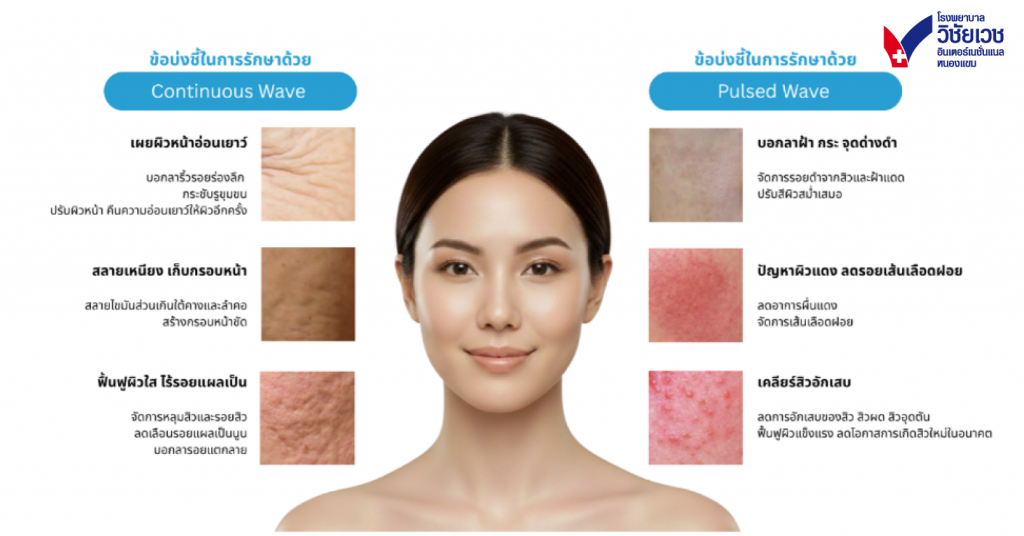 - Continuous Wave (CW): พลังงานแบบต่อเนื่อง ให้ความร้อนสูง เหมาะสำหรับการกระตุ้นคอลลาเจน (Collagen Remodeling) ใช้ในการยกระดับงานผิว ลดริ้วรอย และรักษาหลุมสิว