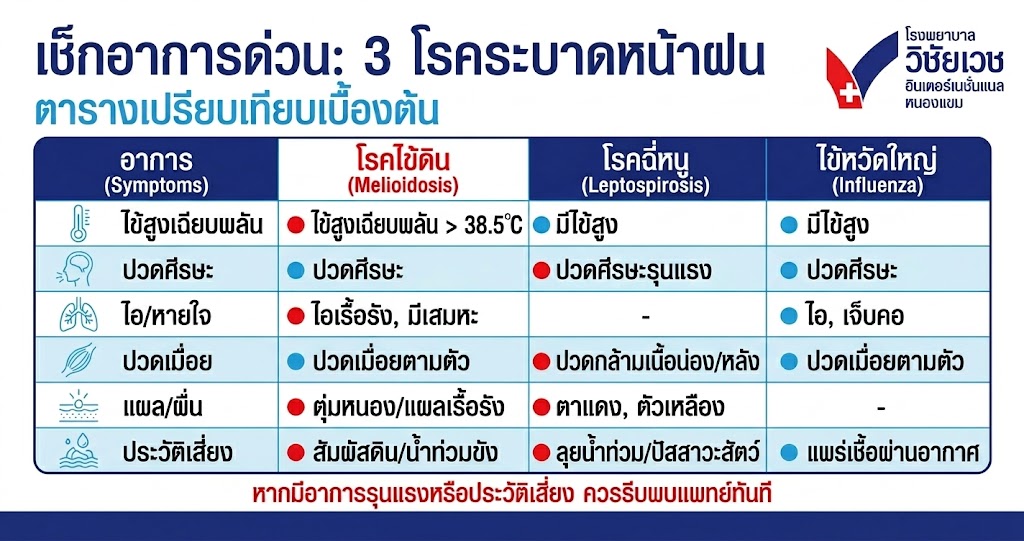 สรุปข้อมูลสำคัญ “โรคเมลิออยด์ เป็นโรคที่ต้องการความรวดเร็วในการวินิจฉัย หากผู้ป่วยมีประวัติโรคเบาหวานและมีไข้สูงหลังลุยน้ำ แพทย์จะตั้งข้อสงสัยและเฝ้าระวังโรคนี้เป็นอันดับต้นๆ การใช้ยาปฏิชีวนะเฉพาะเจาะจงอย่างทันท่วงทีคือปัจจัยที่ช่วยรักษาชีวิตผู้ป่วย การได้รับคำแนะนำและการดูแลอย่างใกล้ชิดจากโรงพยาบาลที่มีความพร้อมทางห้องปฏิบัติการ จึงมีความสำคัญอย่างยิ่ง”
