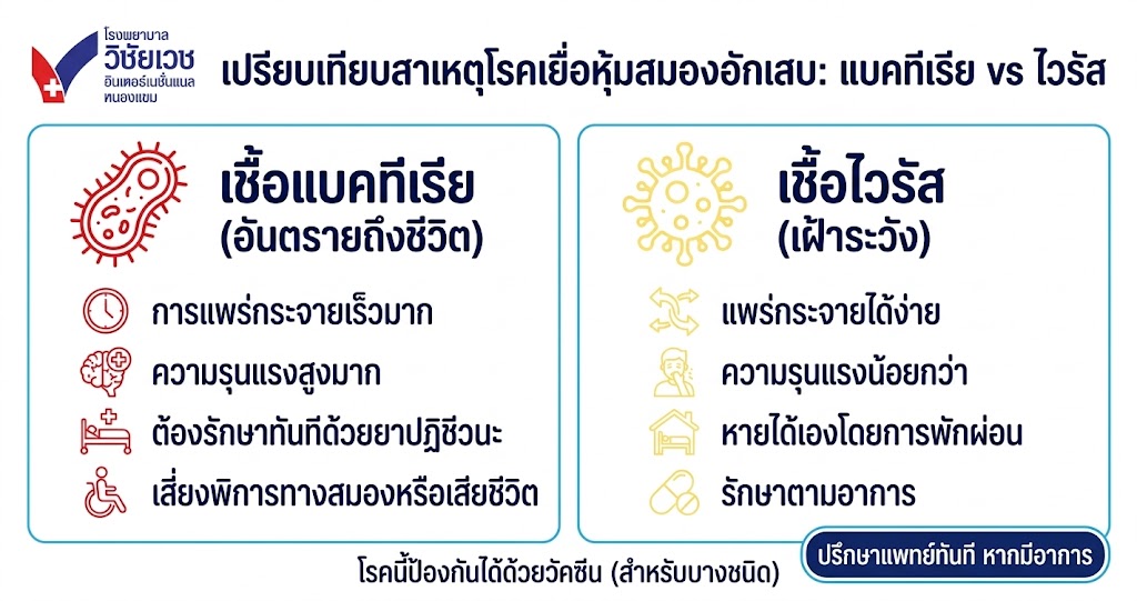 - การติดเชื้อไวรัส (Viral Meningitis): พบได้บ่อยกว่าแบคทีเรีย แต่อาการมักรุนแรงน้อยกว่าและส่วนใหญ่สามารถหายได้เอง สาเหตุเกิดจากกลุ่มเอนเทอโรไวรัส (Enteroviruses) ไวรัสเริม หรืองูสวัด