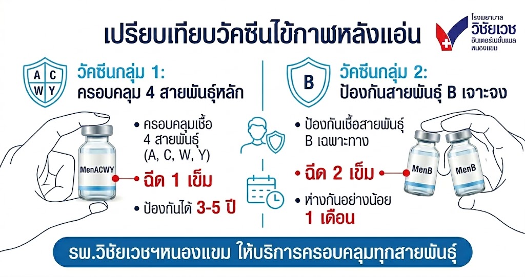 โรคไข้กาฬหลังแอ่น เกิดจากเชื้อแบคทีเรีย Neisseria meningitidis ซึ่งทำให้เกิดการติดเชื้อในกระแสเลือดและเยื่อหุ้มสมองอักเสบอย่างรุนแรง เพื่อให้การป้องกันครอบคลุมและตรงกับสถิติการระบาด ปัจจุบันวัคซีนจะแบ่งออกเป็น 2 กลุ่มหลัก ซึ่งมีรายละเอียดการฉีดที่แตกต่างกัน: