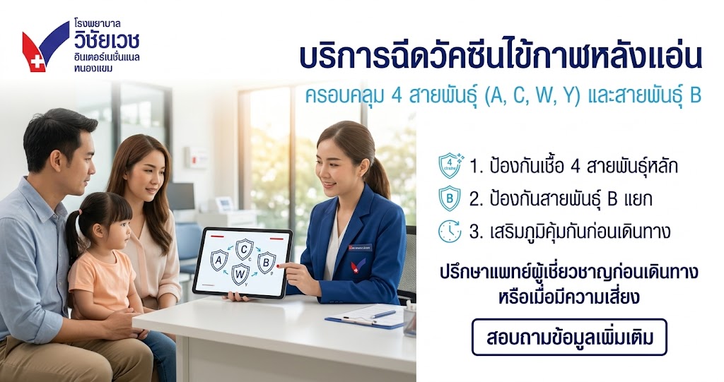 สำหรับท่านที่อาศัยอยู่ในย่าน เพชรเกษม หนองแขม บางแค พุทธมณฑล บรมราชชนนี หรือบริเวณใกล้มหาวิทยาลัยมหิดล ศาลายา ศูนย์วัคซีนและกุมารเวชกรรม โรงพยาบาลวิชัยเวช อินเตอร์เนชั่นแนล หนองแขม พร้อมให้บริการฉีดวัคซีนไข้กาฬหลังแอ่น ครอบคลุมทั้ง 4 สายพันธุ์ (MenACWY) และสายพันธุ์ B ด้วยมาตรฐานระดับสากล พร้อมบริการออกสมุดเล่มเหลือง สะดวก รวดเร็ว ไม่ต้องเดินทางไกลเข้าเมือง