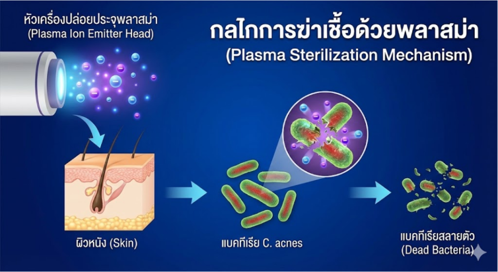 Plasmalis เป็นเทคโนโลยีที่นำพลังงานพลาสม่าเย็น (Cold Atmospheric Plasma – CAP) มาใช้ในการรักษาโรคผิวหนัง โดย “เย็น” ในที่นี้หมายถึงอุณหภูมิขณะสัมผัสผิวจะอยู่เพียง 35-40 องศาเซลเซียส ซึ่งใกล้เคียงกับอุณหภูมิร่างกาย จึงไม่ก่อให้เกิดความร้อนไหม้ผิว (Non-thermal) ไม่เจ็บ และไม่ทำลายเนื้อเยื่อข้างเคียง
