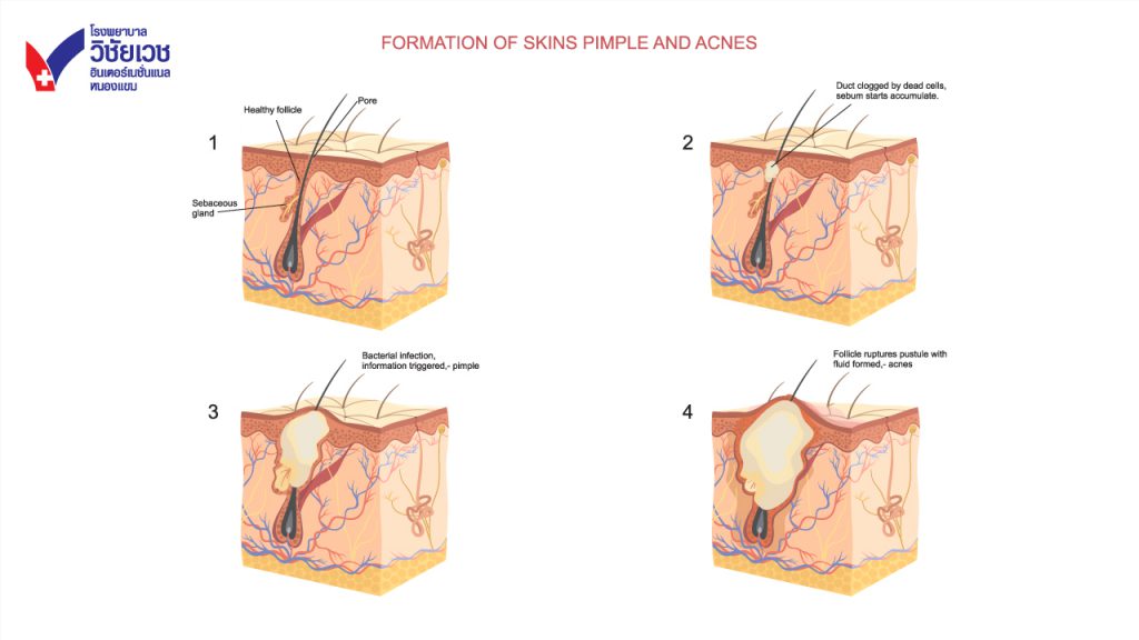 | 4. สิวหนอง | การอักเสบรุนแรงจนผนังรูขุมขนแตกออก (Follicle Rupture) เกิดหนองสะสมภายใน |