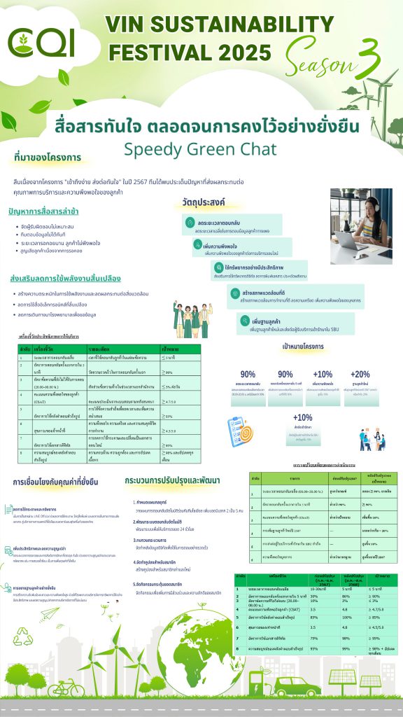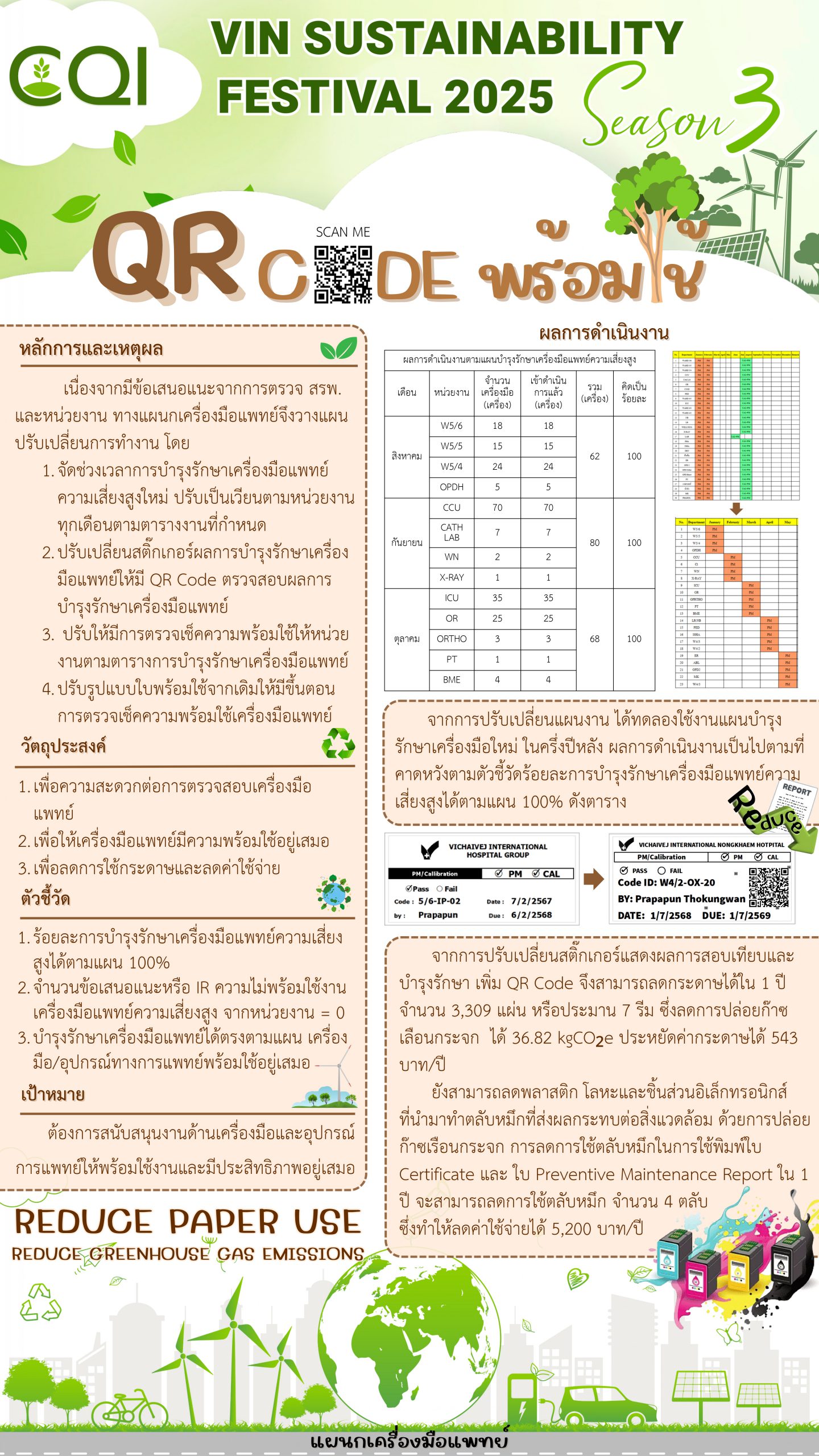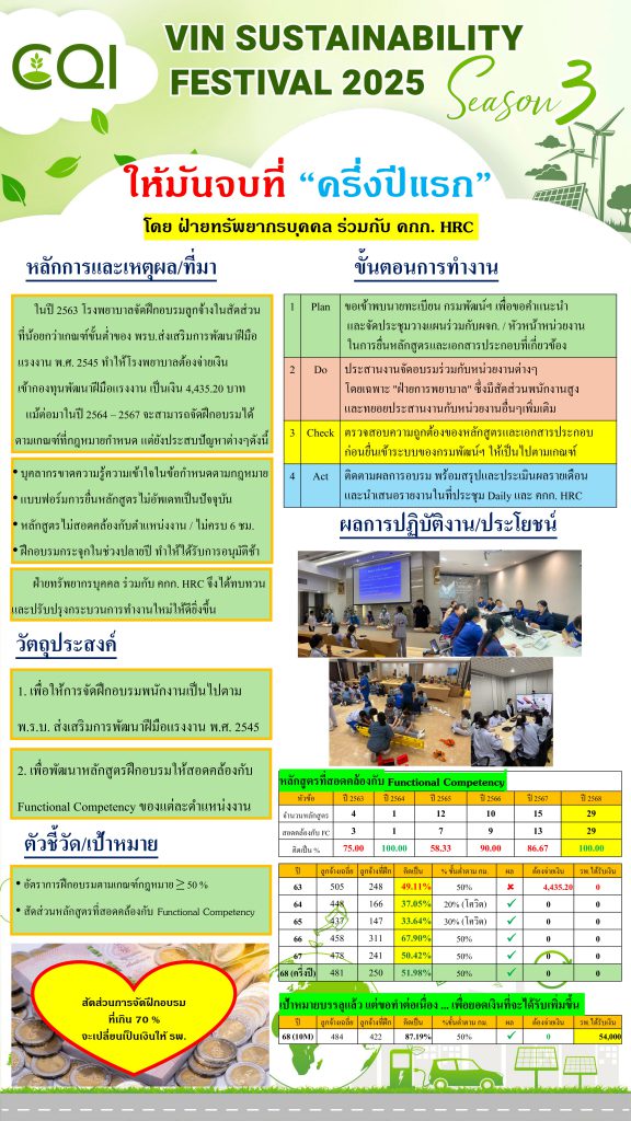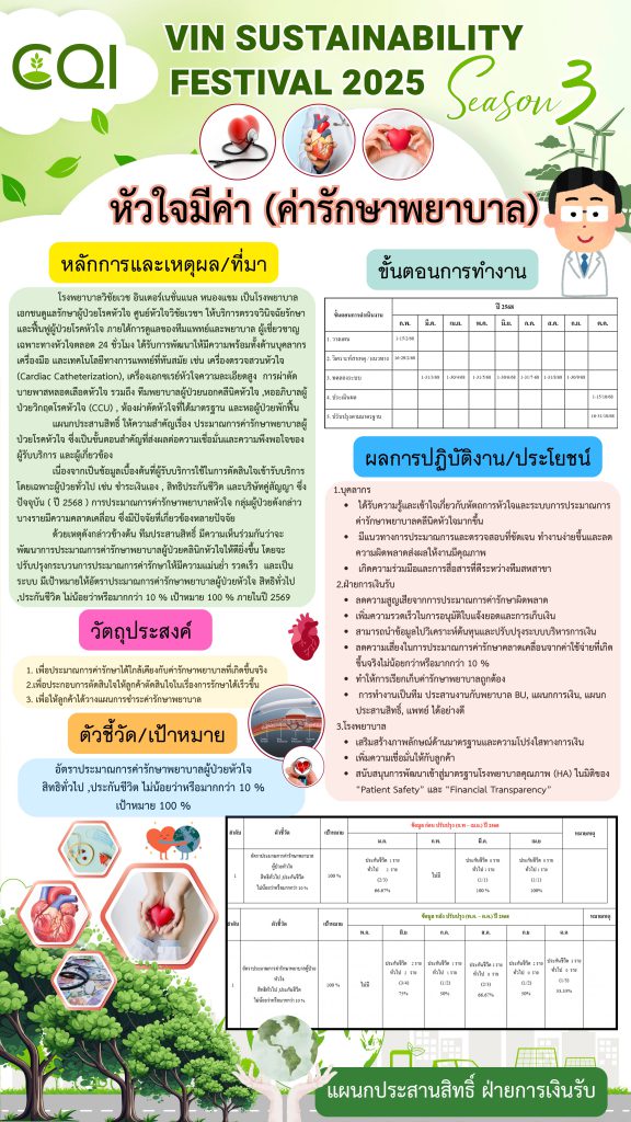 วันที่ 20 พฤศจิกายน 2568 โรงพยาบาลวิชัยเวช อินเตอร์เนชั่นแนล หนองแขม เดินหน้ายกระดับมาตรฐานการบริการและการบริหารจัดการ จัดงานมหกรรมประกวดผลงานคุณภาพ “Vichaivej Quality Fair 2025” ภายใต้แนวคิด “VIN SUSTAINABILITY Festival 2025 Season 3” ณ ห้องประชุมวนดุรงค์วรรณ โดยมีวัตถุประสงค์เพื่อส่งเสริมกิจกรรมพัฒนาคุณภาพ (CQI) และนวัตกรรม พร้อมปลูกฝังจิตสำนึกรักษ์สิ่งแวดล้อมให้แก่บุคลากร