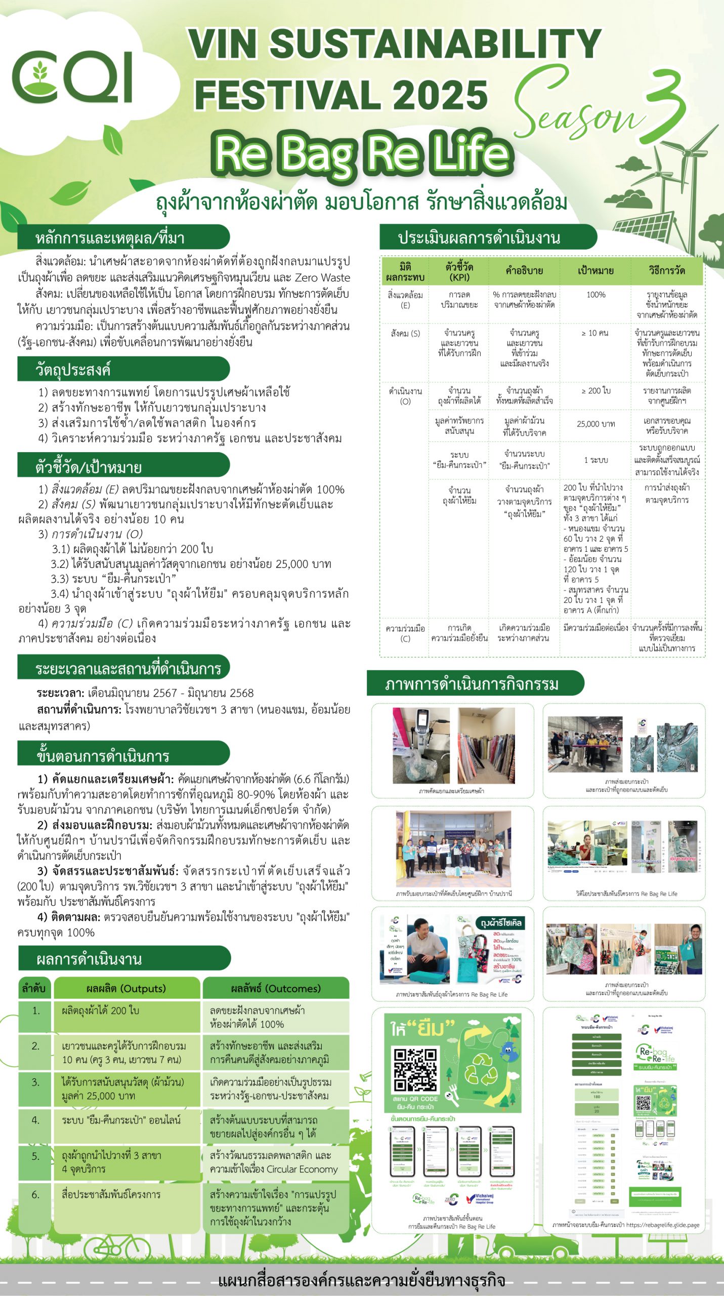 - โครงการ “Re Bag Re Life ถุงผ้าจากห้องผ่าตัด มอบโอกาส ธุรกิจ รักษาสิ่งแวดล้อม” โดย ฝ่ายสื่อสารองค์กรและความยั่งยืน