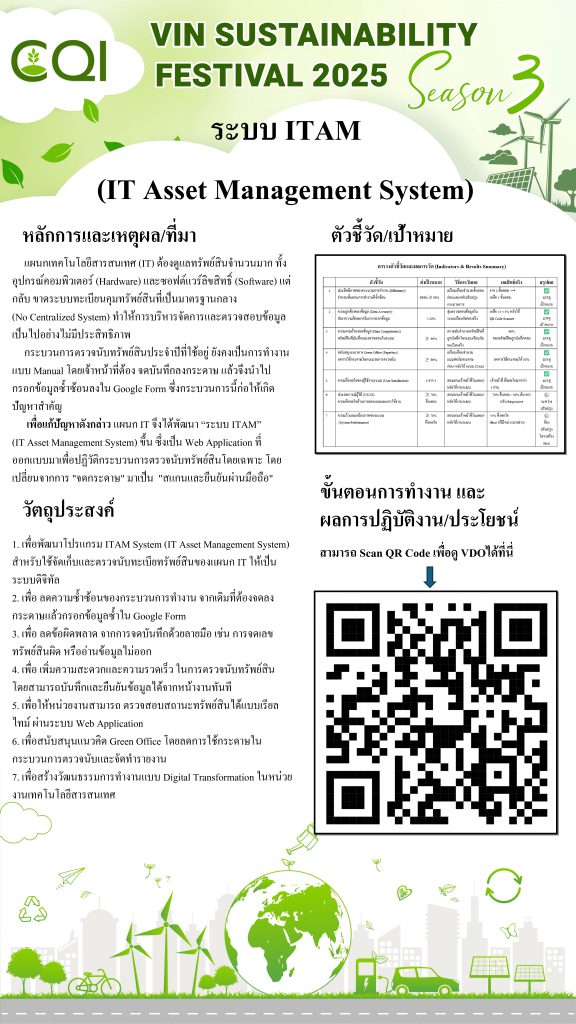 - โครงการ “การพัฒนาระบบทะเบียนคุมทรัพย์สิน IT (IT Asset Management System : ITAM)” โดย แผนกสารสนเทศ